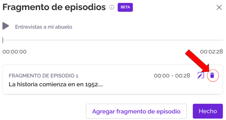 3. A continuación, haz click en el icono del bote de basura para editar tu fragmento de episodio