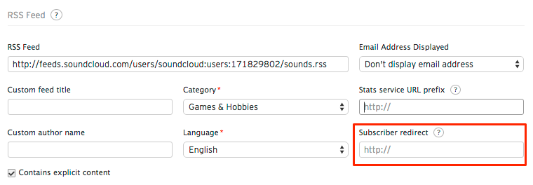 Accedi al tuo account SoundCloud ed accedere alla sezione Content Settings ed inserire l'URL del nuovo feed RSS.com all'interno del campo “Subscriber redirect”. Il redirect sarà impostato per un tempo indefinito.