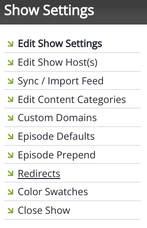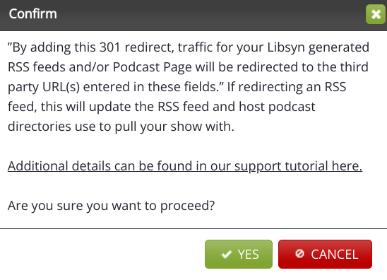 4. Nel campo "Feed Redirect URL" inserisci l'indirizzo del tuo nuovo podcast feed in RSS.com e nel campo "Page Redirect URL" inserisci l'indirizzo web pubblico del tuo nuovo show in RSS.com. Dopo di che clicca il bottone "Save"